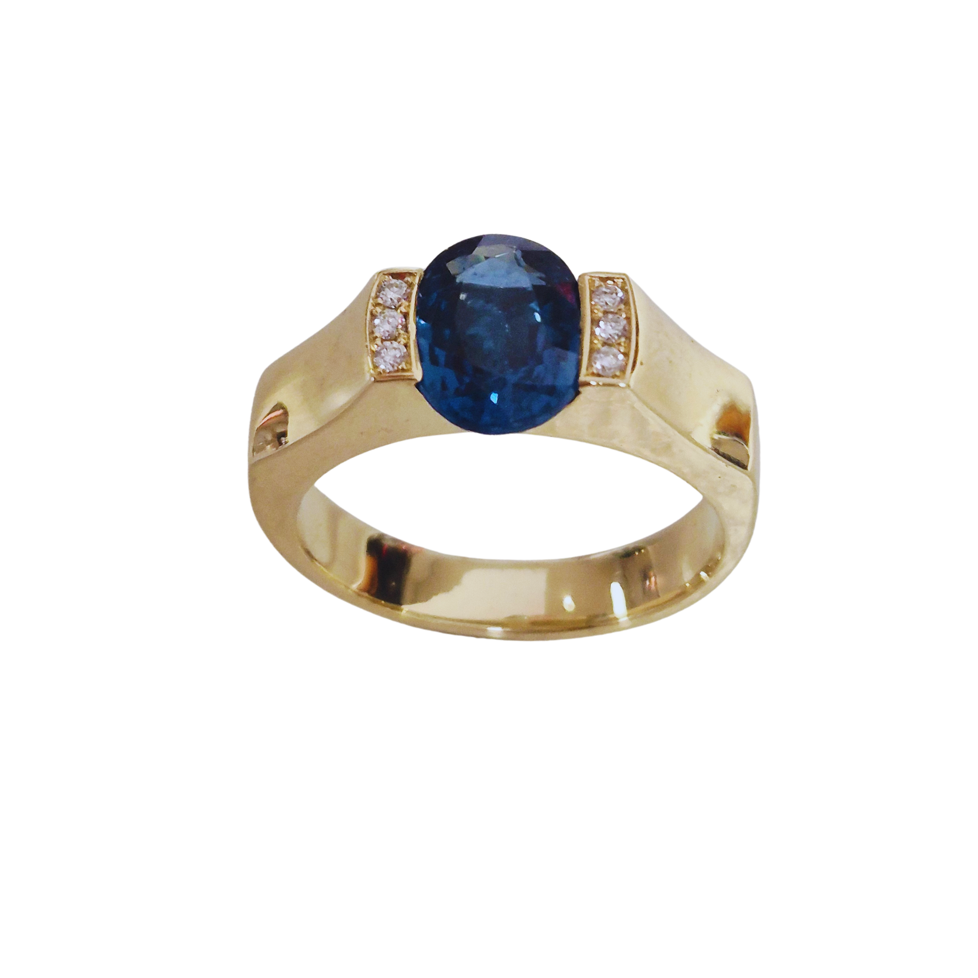 "Classical Modern" - Moderne en tegelijk iets klassieke geelgouden ring met in het midden een ovale facet geslepen kyaniet. De scheen loopt via schuine delen hoger op en vormt daarmee de zetting. De twee delen die de sten vasthouden zijn bezet met briljant geslepen diamant. geheel glanzend afgewerkt.